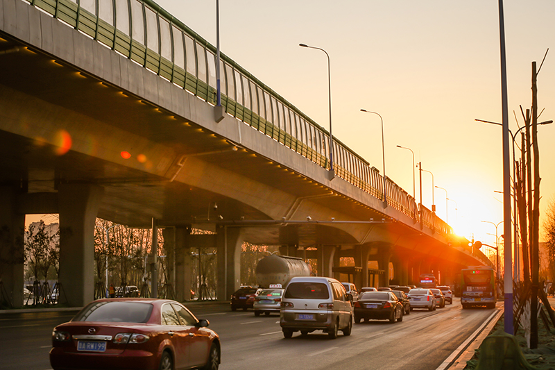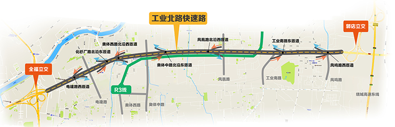 工業(yè)北路快速路西起全福立交橋,東至郭店立交,長13.6公里,標(biāo)準(zhǔn)段寬25.5米,雙向6車道。沿線共設(shè)置8對匝道,其中7對實現(xiàn)高架橋梁與地面道路的連接,在郭店立交設(shè)置一對專用匝道實現(xiàn)高快轉(zhuǎn)換。